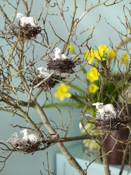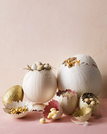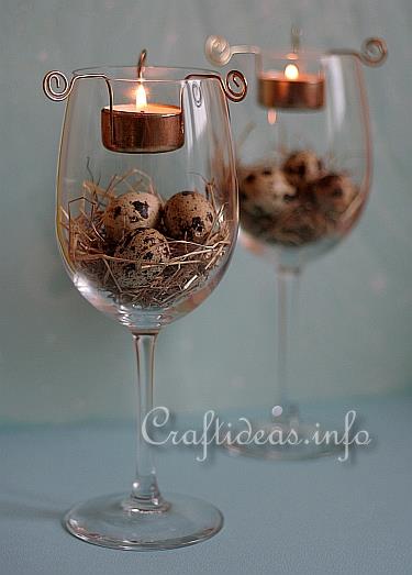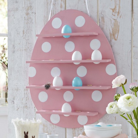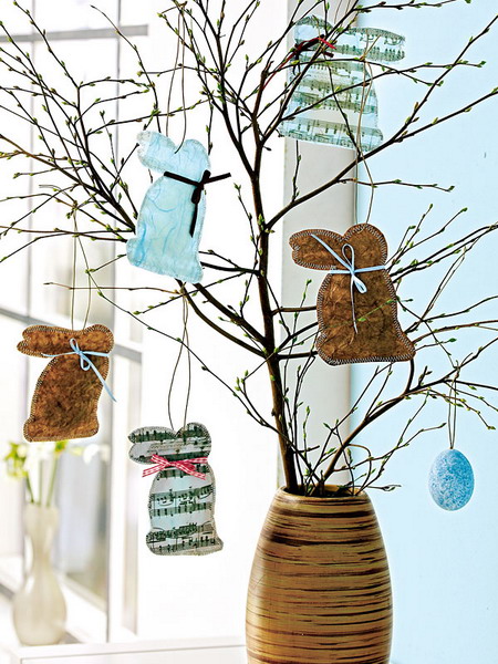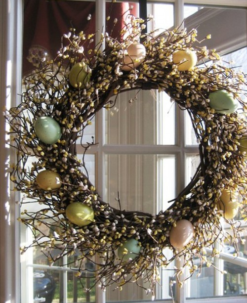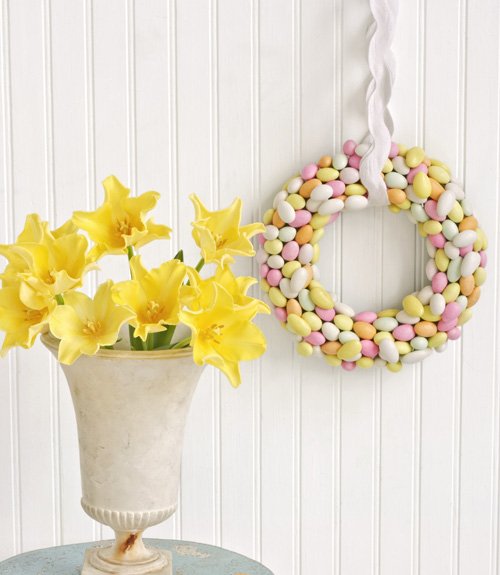 A tumble of pastel eggs is an Easter craft for kids that makes a cheery welcome at the front door. Wrap plastic foam egg shapes (available at crafts supply stores) with strips of crepe paper, attaching ends with glue or a small straight pin. Embellish with ribbon secured using small straight pins, leaving a long end for tying. Gather eggs at varying heights and tie ribbons together. Hang from a removable adhesive hook or wreath hanger, and add a ribbon bow to complete the Easter decoration.
