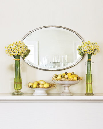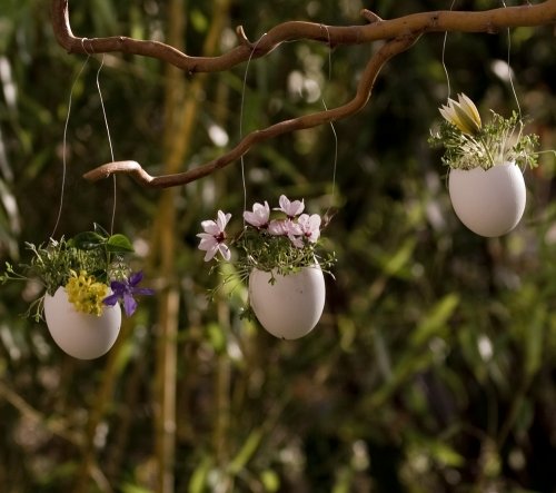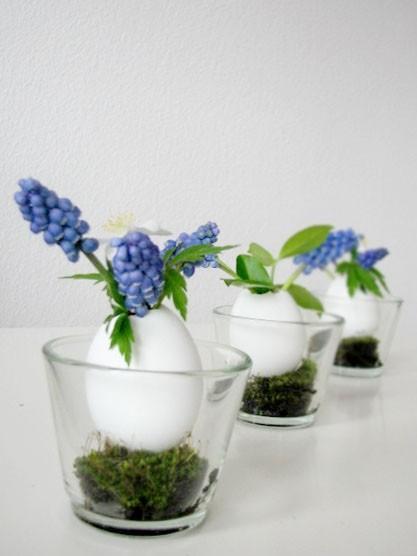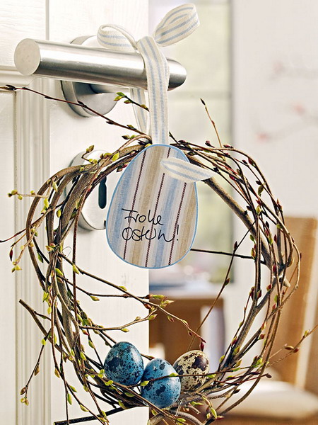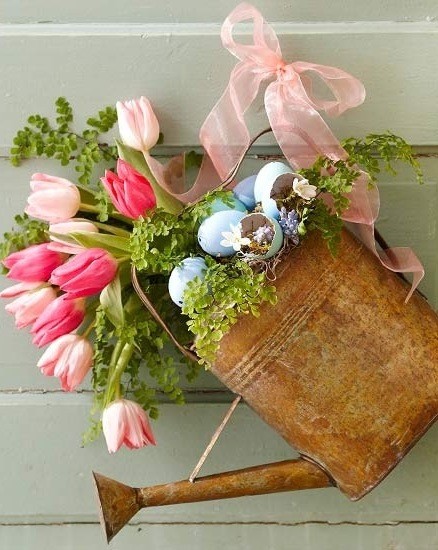 Filling a rustic watering can with pink tulips, greenery, and pastel blue eggshells is the perfect decoration for spring. Stuff the watering can with floral foam to secure the stems. Add picks to blown-out eggshells to secure them as well. When you’re finished creating the arrangement, wire it to your front door and cover the wire with ribbon.