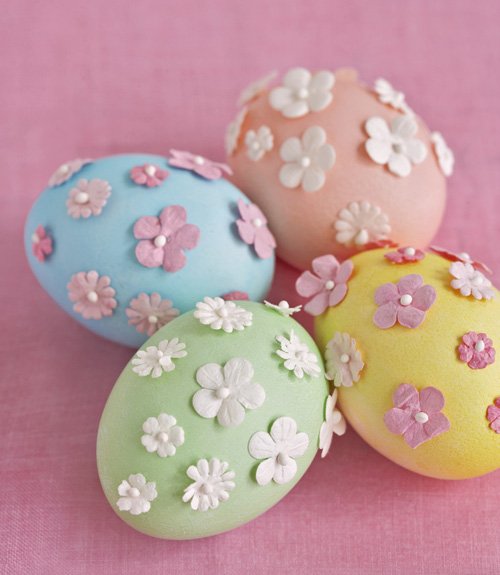 Dye eggs in different colours and let dry completely. Put a sheet of wax paper on the table. Lay a strip of ribbon longer than the circumference of the egg. The right side of the ribbon should be down on the wax paper. Using the foam brush, cover the entire surface of the ribbon with glue. Try not to move ribbon while doing this, so glue wouldn’t go on the underside. Put an egg at one end of the ribbon and roll it until ribbon fully encircles the egg. Let the ribbon overlap the starting point about ¼ inch, then press the end. Smooth ribbon against the egg with your fingers. Let dry.
