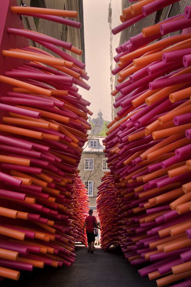 The pool noodles urban installation was created by Les Astronautes as part of Delirious Frites, an architectural art installation created by Les Astronautes.